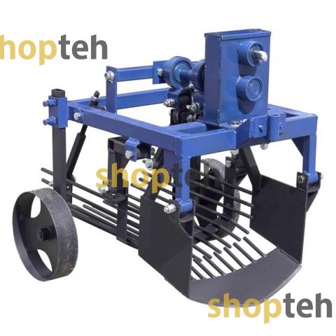 Регулировка глубины выкапывания зависит от диаметра колес, которые установлены на мотоблоке. Опорные колеса картофелекопателя используются для регулировки угла атаки. Прицепное устройство приварено.