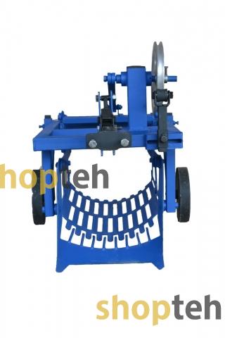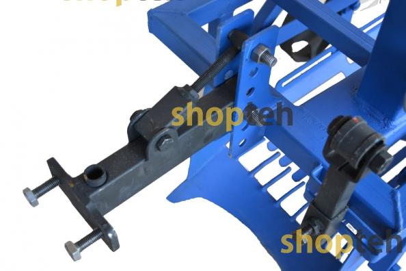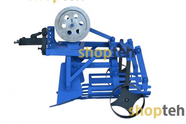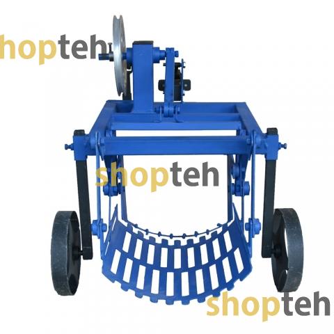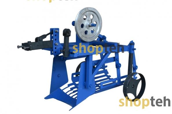 Картофелекопалка, механизированная под ременные мотоблоки оснащена редуктором для уменьшения оборотов и плавности хода. Редуктор имеет выход первичного вала на левую сторону. Вторичный вал выходит на правую сторону и оснащён смещённым центром для привода ножа и вибрационной сетки. На первичный вал устанавливается шкив диаметром 200мм, а также на копалке планка с натяжным роликом. Сцепка оснащена регулировочным винтом для выбора угла атаки.